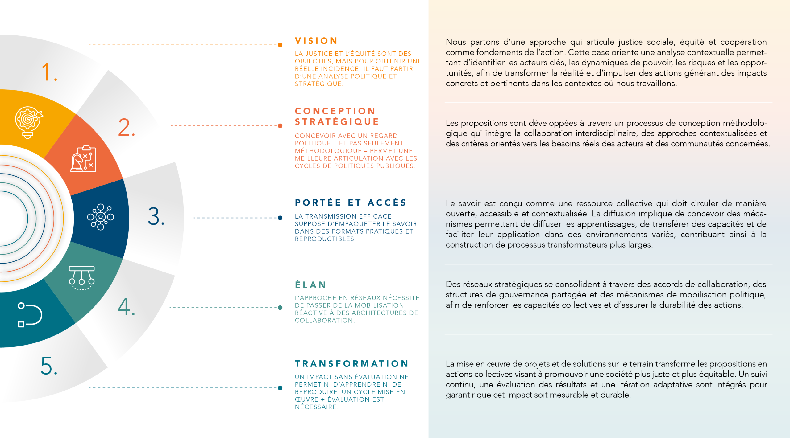 Les interventions stratégiques commencent par une vision normative ancrée dans les principes de justice, d’équité et de coopération. Les connaissances et les ressources sont positionnées au service du bien commun, en identifiant les points de levier pour guider l’action vers des futurs plus inclusifs et durables.